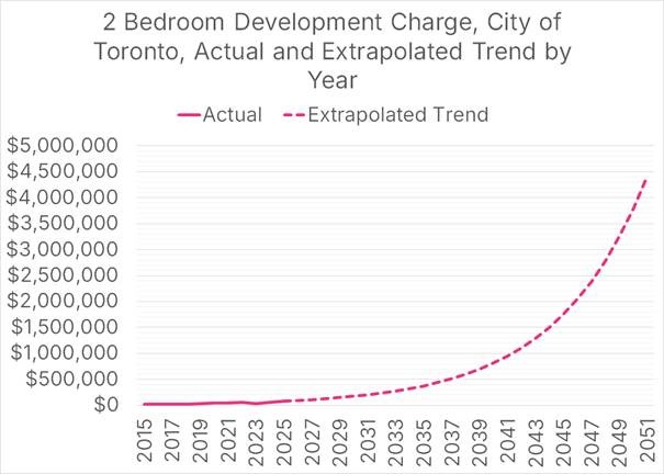 Development Charges for a two-bedroom apartment in Toronto are currently $80,690 per unit and are rising at a rate of 16.7% per year. This level of punitive taxation is simply incompatible with middle-class affordability and Canada’s commitment to treat housing as a human right.