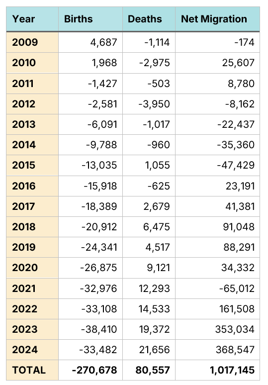 We can conduct a crude version of this analysis by looking at migration patterns for the five years before 2008, to get annual averages for immigration, emigration, interprovincial migration, and net non-permanent resident growth, then project those forward for the next 16 years to get an expected level of migration for 2008-2024, as shown in Figure 4.