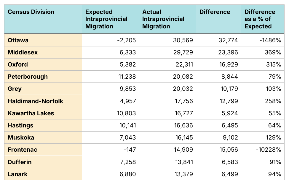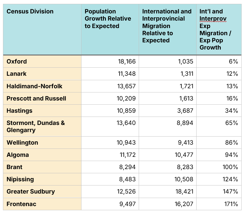 As well, there were a number of communities that grew unexpectedly rapidly that we would not associate with growth driven by immigration, such as the Lanark Census Division just outside of Ottawa and Oxford County in Southwestern Ontario, home to communities such as Woodstock, Tillsonburg, and Ingersoll.