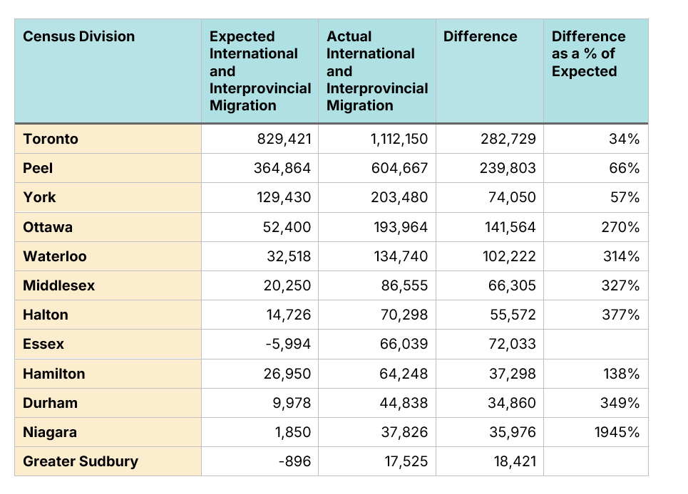 Unsurprisingly, many of the places with unexpectedly high population growth, such as Toronto, Ottawa, and Waterloo Region, also had unexpectedly high migration growth. However, the Regions of Halton, Durham, and York also had unexpectedly high levels of international and interprovincial migration-based growth, and their populations grew more slowly than expected. Peel Region added 240,000 more movers than anticipated, and yet its overall population grew by 160,000 fewer than forecast, as shown in Figure 5.