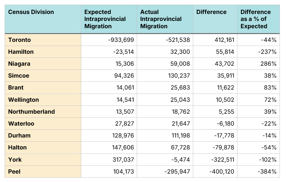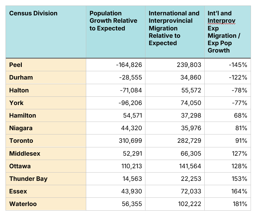 For our four non-Toronto GTA census divisions (Durham, Halton, York, and Peel), it is clear that the unexpectedly low levels of population growth were caused by unexpectedly low intraprovincial migration, rather than due to international and intraprovincial migration being lower than forecast.