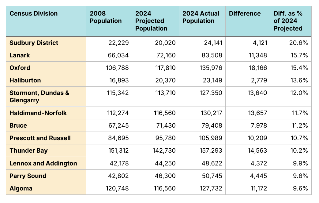 Figure 8 shows the 12 Ontario Census Divisions with the highest actual net intraprovincial migration figures for 2008-24 that were not included in Figure 7. In every single case, actual intraprovincial migration substantially exceeded forecasts.