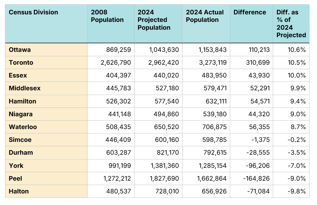 That conjecture would only be partially true. While the City of Toronto, along with “college” towns like Windsor, London, and Hamilton, did grow faster than expected, most of the GTA added fewer people than projected in 2009. Despite Ontario’s unforecasted (in 2009) population boom, The Regions of Durham, York, Peel, and Halton all saw their populations grow substantially less than projected, with Peel and Halton’s populations being 9% smaller in 2024 than forecasted.