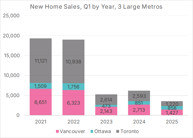 Figure 1: New Home Sales, Q1 by Year, Three Large Urban Metros