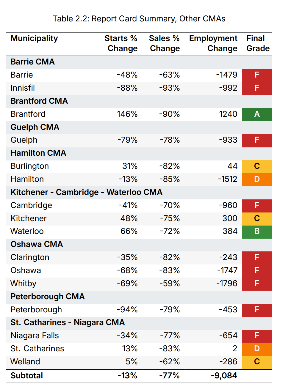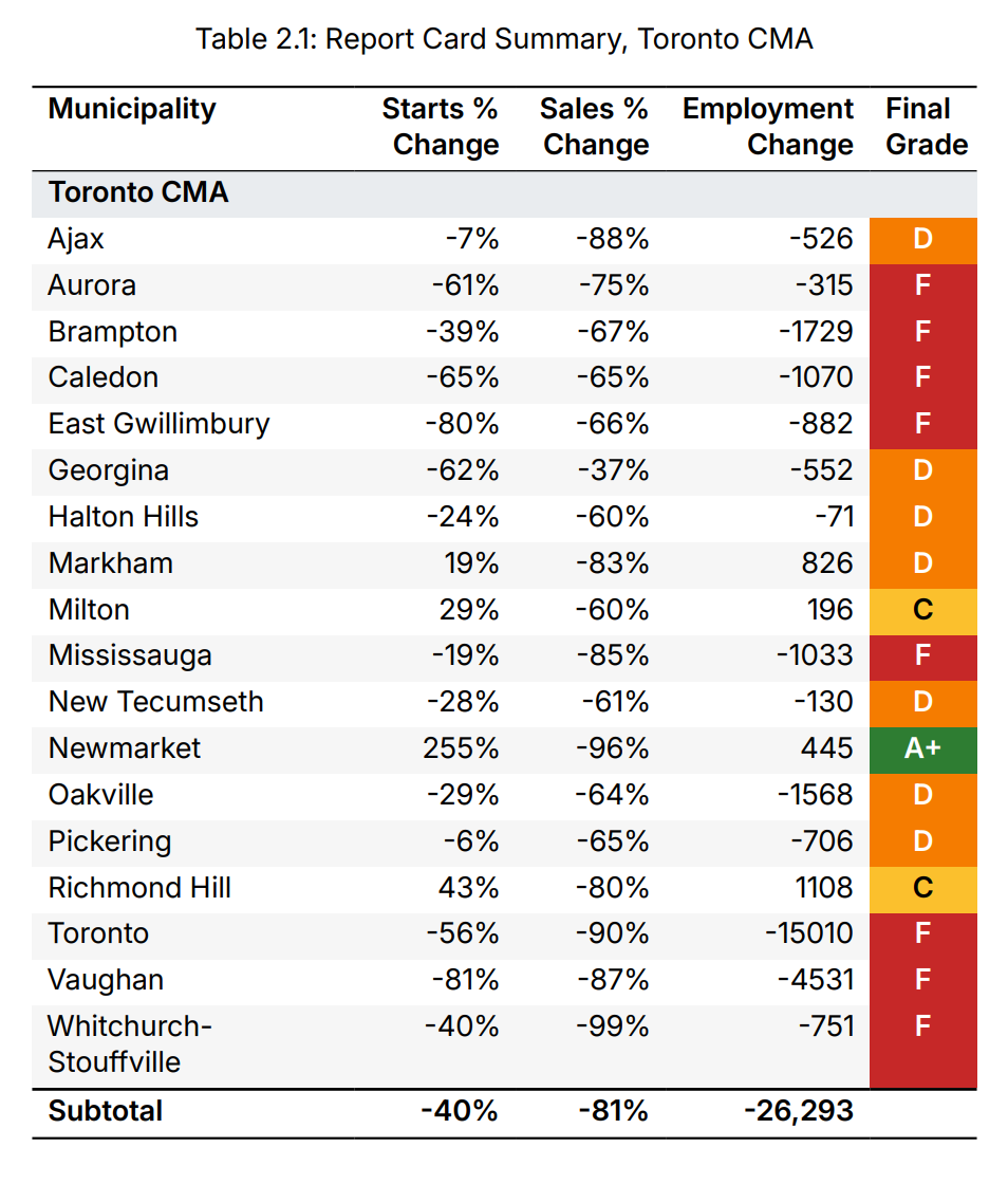 Each of our 34 municipalities was assessed across five categories, three reflecting starts (ground-oriented, condo apartments, rental apartments) and two reflecting sales (ground-oriented, condo apartments), and given a grade; see the methodology section for details. 7 For our 34 municipalities, 17 (-5 vs. Q2 2025) received an F, and another 9 (+4 vs. Q2 2025) received a D. While the other eight municipalities received a C or higher (+1 vs. Q2 2025). Average grades have improved slightly since Q2 2025, but because starts are a lagging indicator, we continue to expect average grades to fall in future reports.