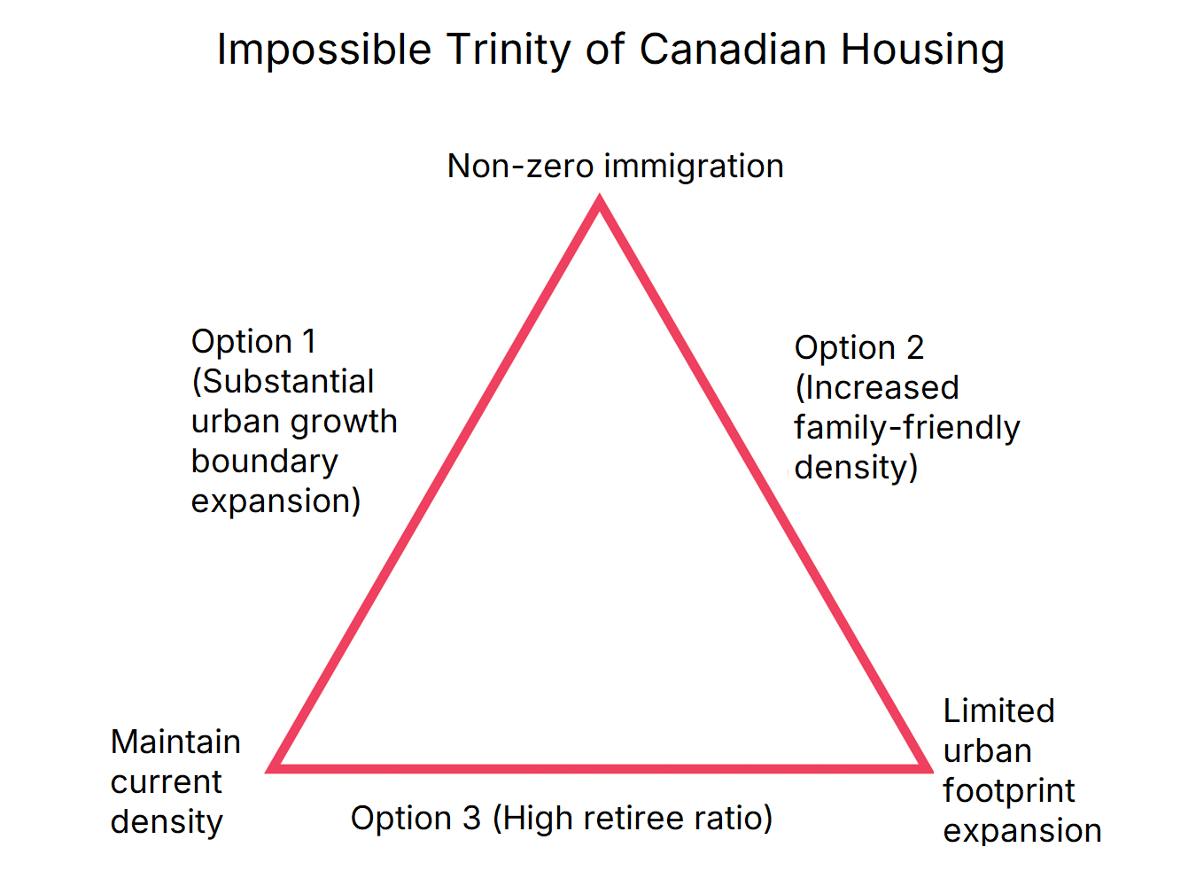 The Impossible Trinity of Housing states that there are three pathways to address a shortage of family-sized housing: Allow building outward through extending urban growth boundaries, legalize gentle density through changes to zoning policies, building codes and development charges, or cut population growth rates by reducing immigration rates or non-permanent resident programs. It also states that while achieving housing affordability through a triple combination of robust immigration, tight urban growth boundaries, and family-friendly densification is possible, it requires a level of discipline typically not seen across any order of government in Canada.