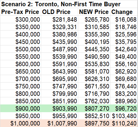 Under the first scenario, a home that would cost $889,995 after rebates and land-transfer tax would fall to under $800,000, resulting in a savings of nearly $95,000.