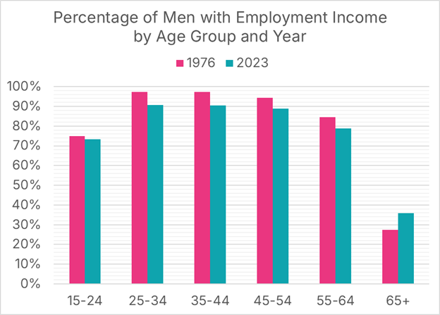 The proportion of men who earn employment income each year has fallen since 1976, for every age group, except seniors, where it has risen considerably.
