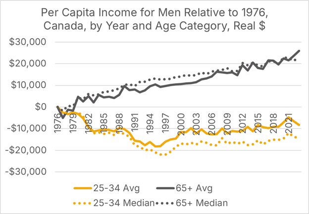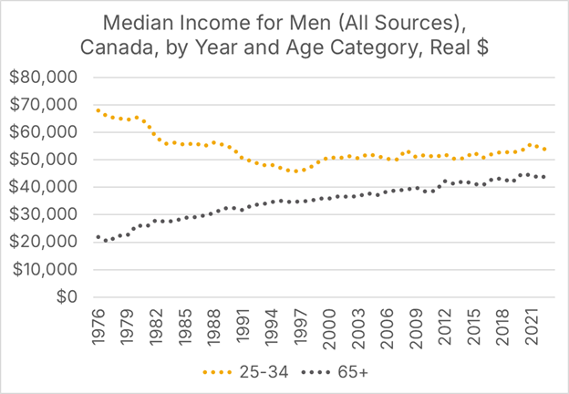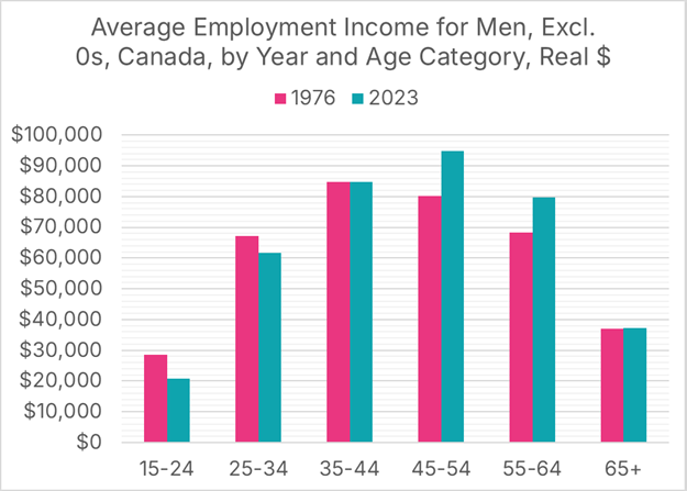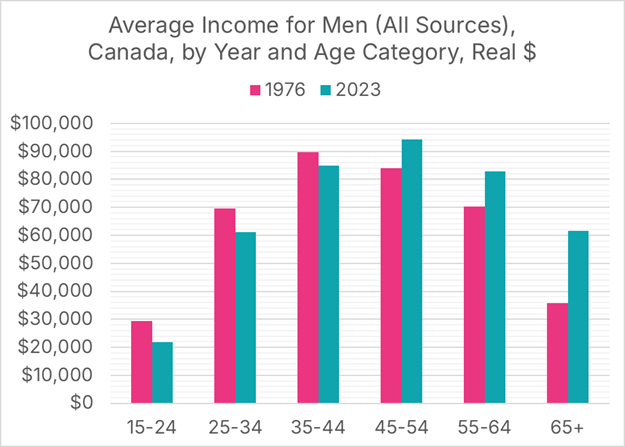 Statistics Canada’s Canadian Income Survey is a useful place to start. The Survey’s Table 11-10-0239-01 contains after-tax, real (inflation-adjusted) incomes for men by age category, spanning the years 1976 through 2023. Men under the age of 45 are, on average, earning less after inflation than their counterparts did in 1976, while those 45 and older are earning more. Seniors, in particular, have experienced a large increase in average incomes since 1976.