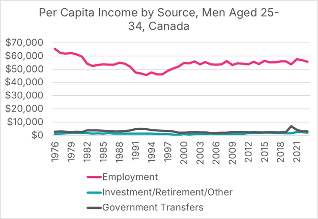 For younger men, government transfers are virtually unchanged (in real terms) since 1976; they earn little money from investments, and employment incomes have fallen.