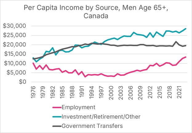 Seniors’ gains come from working more and saving more: Older men now work later into life, boosting employment income, while investment and retirement income have more than doubled since 1976, and government transfers have become far more generous.