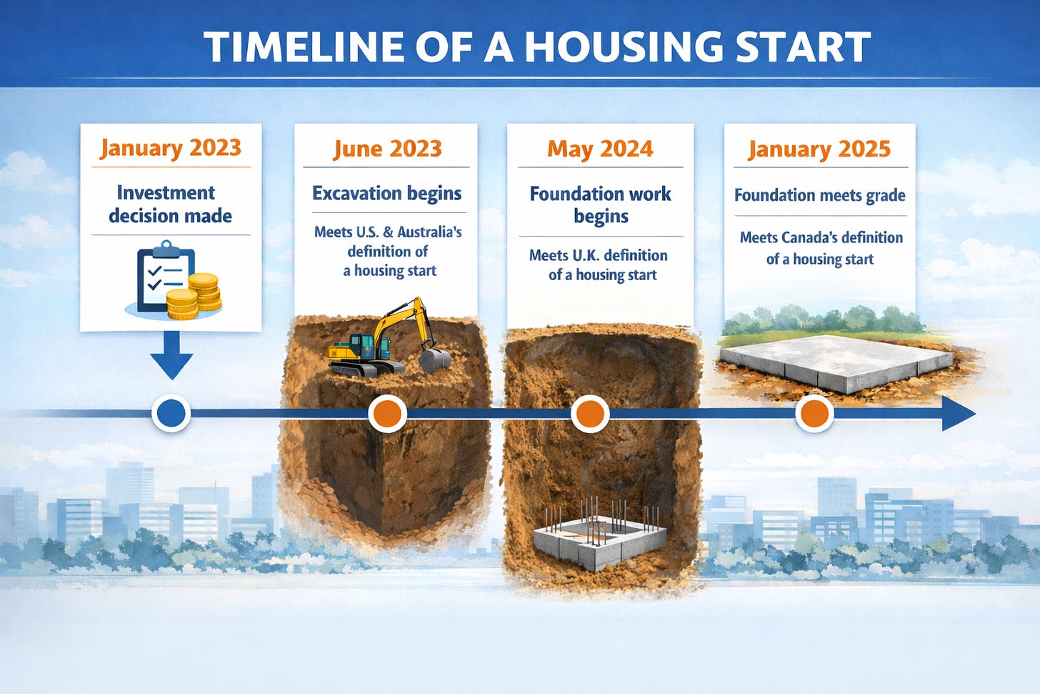 Figure 2: Timeline of a real-world housing start, and how it would be measured in the U.S., Australia, the U.K. and Canada