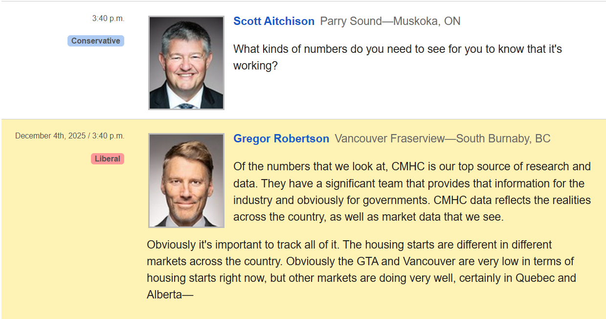 The last point is particularly critical. A recent example of this a December 2025 exchange in the House of Commons Human Resources Committee between Housing Minister Gregor Robertson and Conservative Housing Critic Scott Aitchison. In response to a question on the use of metrics, Robertson cited housing starts as a primary indicator, and suggested that they show that Alberta’s new housing market is doing “very well”.